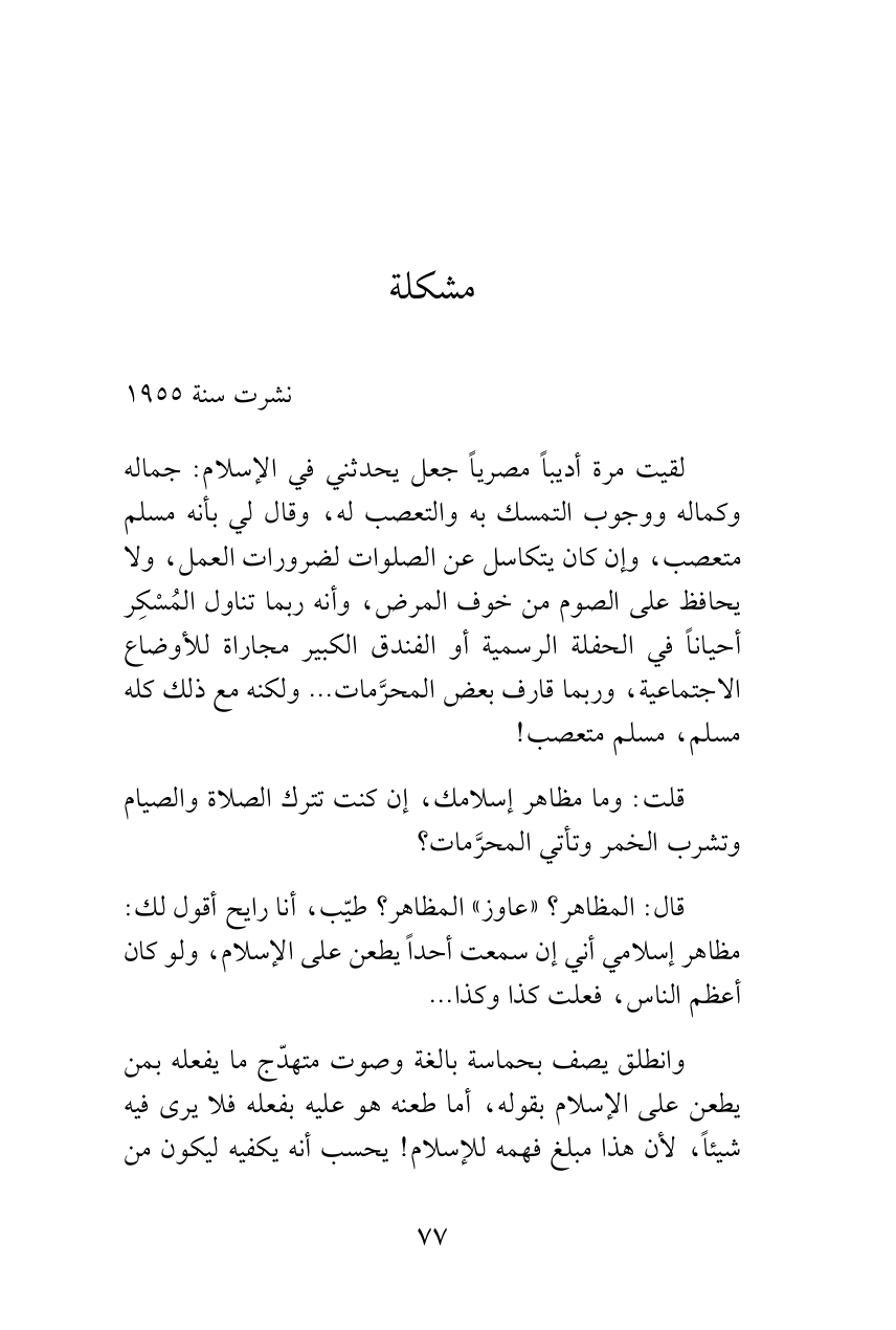 لقيت مرة أديباً مصرياً جعل يحدثني في الإسلام: جماله وكماله ووجوب التمسك به والتعصب له، وقال لي بأنه مسلم متعصب، وإن كان يتكاسل عن الصلوات لضرورات العمل، ولا يحافظ على الصوم من خوف المرض، وأنه ربما تناول المُسْكِر أحياناً في الحفلة الرسمية أو الفندق الكبير مجاراة للأوضاع الاجتماعية، وربما قارف بعض المحرَّمات ... ولكنه مع ذلك كله مسلم، مسلم متعصب!