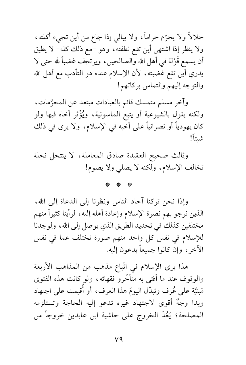 حلالاً ولا يحرّم حراماً، ولا يبالي إذا جاع من أين تجيء أكلته، ولا ينظر إذا اشتهى أين تقع نطفته، وهو -مع ذلك كله- لا يطيق أن يسمع قَوْلة في أهل الله والصالحين، ويرتجف غضباً لله حتى لا يدري أين تقع غضبته، لأن الإسلام عنده هو التأدب مع أهل الله والتوجه إليهم والتماس بركاتهم!