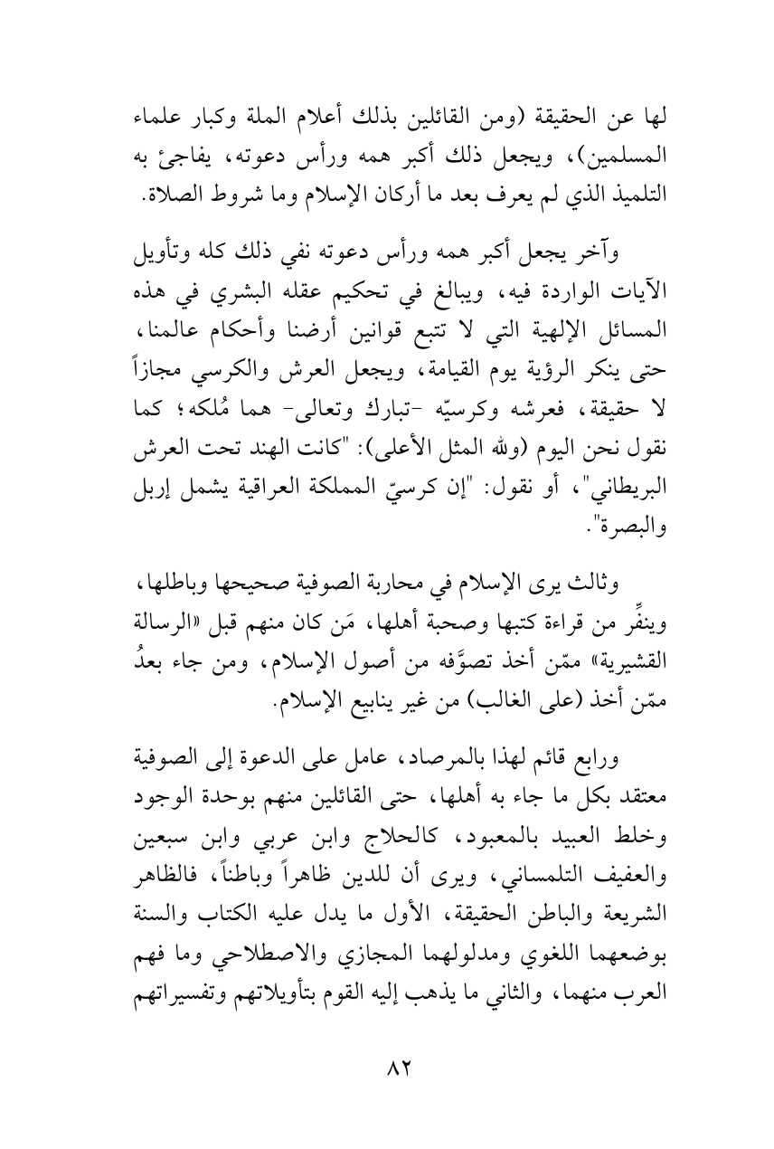 وآخر يجعل أكبر همه ورأس دعوته نفي ذلك كله وتأويل الآيات الواردة فيه، ويبالغ في تحكيم عقله البشري في هذه المسائل الإلهية التي لا تتبع قوانين أرضنا وأحكام عالمنا، حتى ينكر الرؤية يوم القيامة، ويجعل العرش والكرسي مجازاً لا حقيقة، فعرشه وكرسيّه -تبارك وتعالى- هما مُلكه؛ كما نقول نحن اليوم (ولله المثل الأعلى): "كانت الهند تحت العرش البريطاني"، أو نقول: "إن كرسيّ المملكة العراقية يشمل إربل والبصرة".