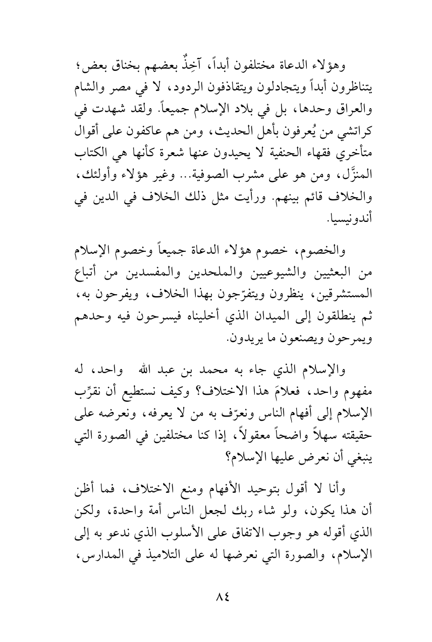 وهؤلاء الدعاة مختلفون أبداً، آخِذٌ بعضهم بخناق بعض؛ يتناظرون أبداً ويتجادلون ويتقاذفون الردود، لا في مصر والشام والعراق وحدها، بل في بلاد الإسلام جميعاً. ولقد شهدت في كراتشي من يُعرفون بأهل الحديث، ومن هم عاكفون على أقوال متأخري فقهاء الحنفية لا يحيدون عنها شعرة كأنها هي الكتاب المنزَّل، ومن هو على مشرب الصوفية ... وغير هؤلاء وأولئك، والخلاف قائم بينهم. ورأيت مثل ذلك الخلاف في الدين في أندونيسيا.