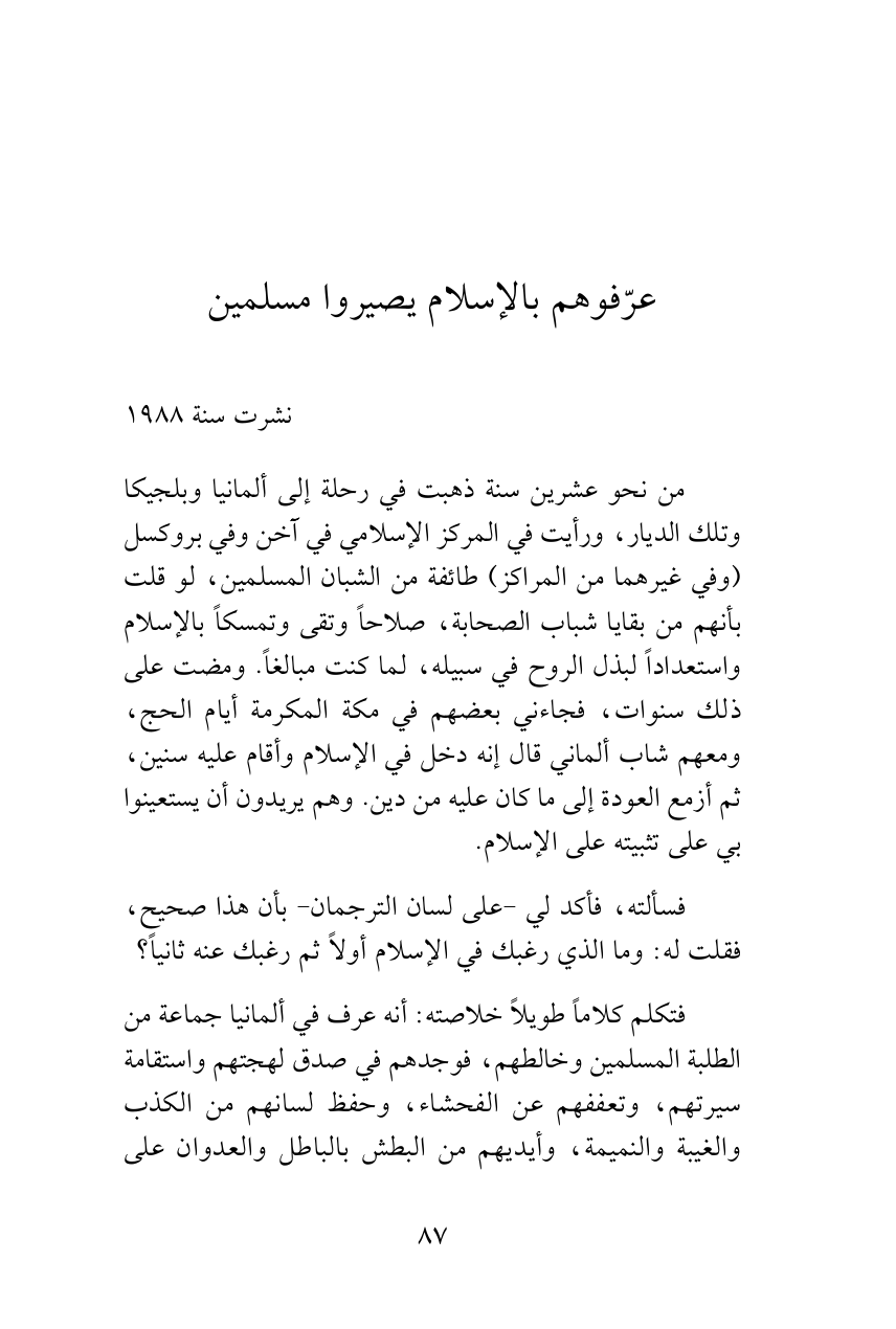من نحو عشرين سنة ذهبت في رحلة إلى ألمانيا وبلجيكا وتلك الديار، ورأيت في المركز الإسلامي في آخن وفي بروكسل (وفي غيرهما من المراكز) طائفة من الشبان المسلمين، لو قلت بأنهم من بقايا شباب الصحابة، صلاحاً وتقى وتمسكاً بالإسلام واستعداداً لبذل الروح في سبيله، لما كنت مبالغاً. ومضت على ذلك سنوات، فجاءني بعضهم في مكة المكرمة أيام الحج، ومعهم شاب ألماني قال إنه دخل في الإسلام وأقام عليه سنين، ثم أزمع العودة إلى ما كان عليه من دين. وهم يريدون أن يستعينوا بي على تثبيته على الإسلام.