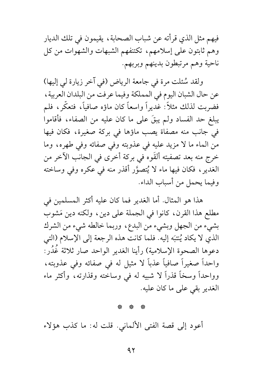 ولقد سُئلت مرة في جامعة الرياض (في آخر زيارة لي إليها) عن حال الشبان اليوم في المملكة وفيما عرفت من البلدان العربية، فضربت لذلك مثلاً: غديراً واسعاً كان ماؤه صافياً، فتعكّر، فلم يبلغ حد الفساد ولم يبقَ على ما كان عليه من الصفاء، فأقاموا في جانب منه مصفاة يصب ماؤها في بركة صغيرة، فكان فيها من الماء ما لا مزيد عليه في عذوبته وفي صفائه وفي طهره، وما خرج منه بعد تصفيته ألقَوه في بركة أخرى في الجانب الآخر من الغدير، فكان فيها ماء لا يُتصوَّر أقذر منه في عكره وفي وساخته وفيما يحمل من أسباب الداء.