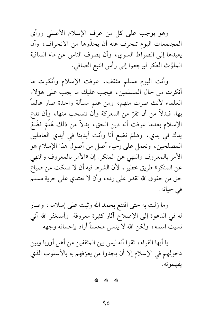 وأنت اليوم مسلم مثقف، عرفت الإسلام وأنكرت ما أنكرت من حال المسلمين، فيجب عليك ما يجب على هؤلاء العلماء لأنك صرت منهم، ومن علم مسألة واحدة صار عالماً بها. فبدلاً من أن تفرّ من المعركة وأن تنسحب منها، وأن تدع الإسلام بعدما عرفت أنه دين الحق، بدلاً من ذلك هَلُمّ فضَعْ يدك في يدي، وهلمّ نضع أنا وأنت أيدينا في أيدي العاملين المصلحين، ونعمل على إحياء أصل من أصول هذا الإسلام هو الأمر بالمعروف والنهي عن المنكر. إن «الأمر بالمعروف والنهي عن المنكر» طريق خطير، لأن الشرط فيه أن لا تسكت عن ضياع حق من حقوق الله تقدر على رده، وأن لا تعتدي على حرية مسلم في حياته.