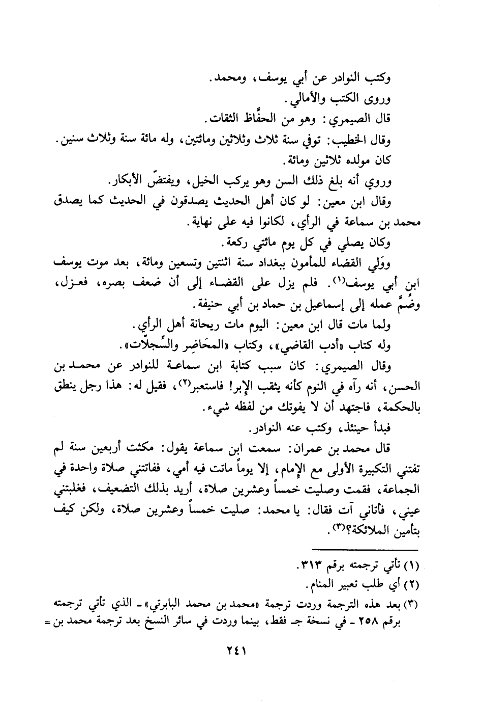 قال محمد بن عمران: سمعت ابن سماعة يقول: مكثت أربعين سنة لم تفتني التكبيرة الأولى مع الإمام إلا يوم ماتت فيه أمي ففاتتني صلاة واحدة في الجماعة، فقمت فصليت خمسا وعشرين صلاة، أريد بذلك التضعيف فغلبتني عيني فأتاني آتٍ فقال: يا محمد! صليتَ خمسا وعشرين صلاة ولكن كيف بتأمين الملائكة؟ والله أعلم.