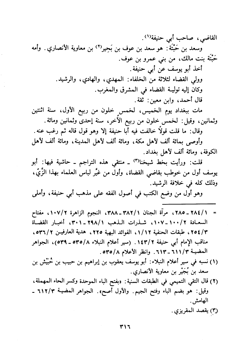 قلت: ورأيت بخط شيخنا-منتقي هذه التراجم- حاشية فيها: أبو يوسف أول من خوطب بقاضي القضاة، وأول من غيَّر لباس العلماء بهذا الزَّيّ، وذلك كله في خلافة الرشيد.