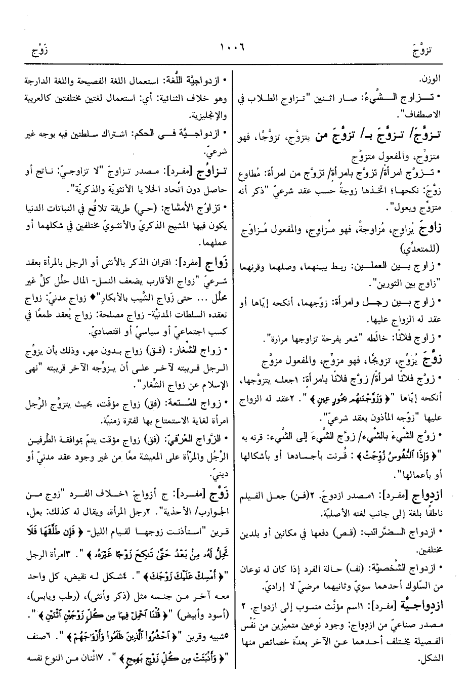 • زوَّج الشَّيءَ بالشَّيء/ زوَّج الشَّيءَ إلى الشَّيء: قرنه به " {وَإِذَا النُّفُوسُ زُوِّجَتْ}: قُرنت بأجسادها أو بأشكالها أو بأعمالها".