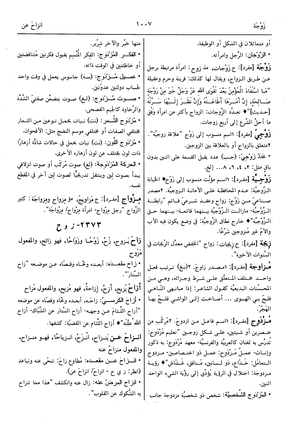2 - مصدر صناعيّ من زَوْج: زواج وعقد شرعيّ قائم "رابطة الزَّوْجيَّة- مازالت الزَّوْجيَّة بينهما قائمة- بينهما حق الزَّوْجيَّة" ° خارج نطاق الزَّوجيَّة: في وضع يكون فيه الأب والأمّ غير مُتزوجين شَرْعًا.