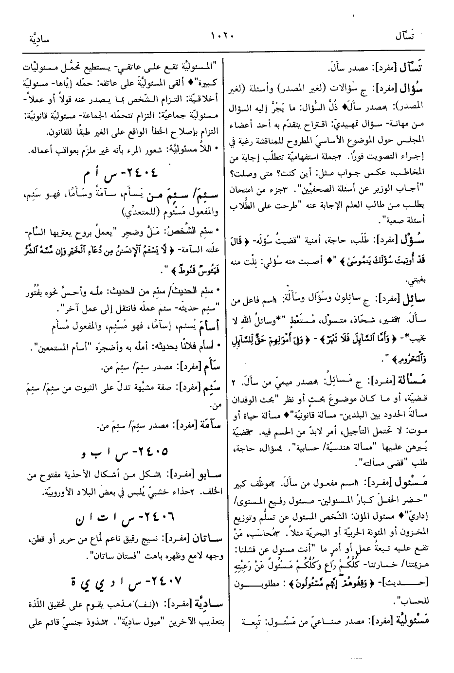 3 - مُحاسَب، مَنْ تقع عليه تبعةُ عملٍ أو أمرٍ ما "أنت مسئول عن فشلنا: هزيمتنا/ خسارتنا- كُلُّكُمْ رَاعٍ وَكُلُّكُمْ مَسْئُولٌ عَنْ رَعِيَّتِهِ [حديث]- {وَقِفُوهُمْ إِنَّهُمْ مَسْئُولُونَ}: مطلوبون للحساب".