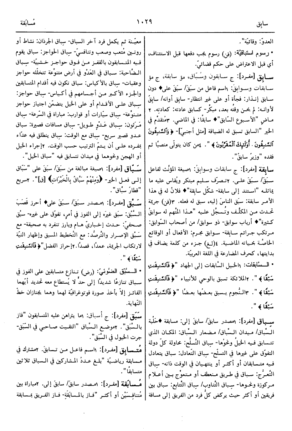1 - مصدر سابقَ/ سابقَ إلى: مسابقة ° حَلْبة السِّباق/ ميدان السِّباق/ مضمار السِّباق: المكان الذي تتسابق فيه الخيلُ ونحوُها- سِباق التَّسلُّح: محاولة كلّ دولة التفوّق على غيرها في التسلّح- سِباق التّعادل: سباق يتعادل فيه متسابقان أو أكثر أو ينتهيان في الوقت ذاته- سِباق التَّعرُّج: سباق في طريق منعطف أو متموِّج بين أعلام مركوزة ونحوها- سِباق التَّناوب/ سِباق التَّتابع: سباق بين فريقين أو أكثر حيث يركض كلُّ فرد من الفريق إلى مسافة معيّنة ثم يكمل فرد آخر السباق- سِباق الجرذان: نشاط أو روتين مُتعب وصعب وتنافسيّ- سِباق الحواجز: سباق يقوم فيه المتسابقون بالقفز من فوق حواجز خشبيّة- سِباق الضَّاحية: سباق في العَدْو في أرض متنوِّعة تتخلّله حواجز وعقبات- سِباق بالأكياس: سباق تكون فيه أقدام المتسابقين والجزء الأكبر من أجسامهم في أكياس- سِباق حواجز: سِباق على الأقدام أو على الخيل يتضمّن اجتياز حواجز متنوِّعة- سِباق سيّارات أو قوارب: مباراة في السّرعة- سِباق مَرَثون: سِباق عَدْوٍ طويل- سِباق مسافات قصيرة: سباق عدو قصير سريع- سِباق مع الوقت: سِباق ينطلق فيه عدّاء بمفرده على أن يتمّ الترتيب حسب الوقت.