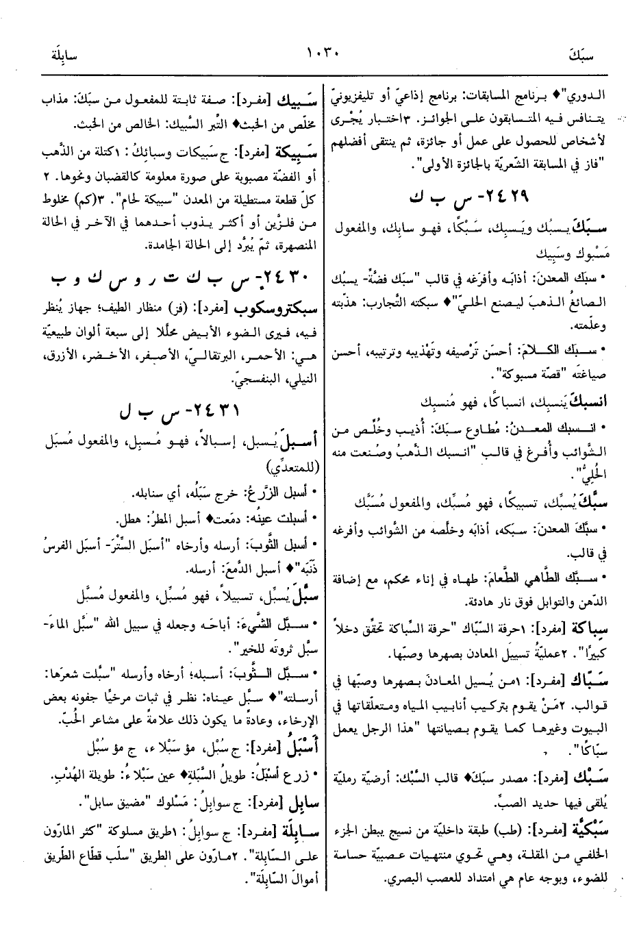 • سبَّل الثَّوبَ: أسبله؛ أرخاه وأرسله "سبَّلت شعرَها: أرسلته" ° سبَّل عيناه: نظر في ثبات مرخيًا جفونه بعض الإرخاء، وعادةً ما يكون ذلك علامةً على مشاعر الحُبّ.