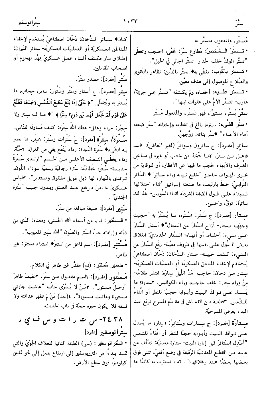 2 - ما استترت به كائنًا ما كان ° ستائر الدُّخان: دُخّان اصطناعيّ يُستخدم لإخفاء المناطق العسكريّة أو العمليّات العسكريّة- ستائر النِّيران: إطلاق نار مكثف أثناء عمل عسكريّ يمهِّد لهجوم أو انسحاب المقاتلين.
