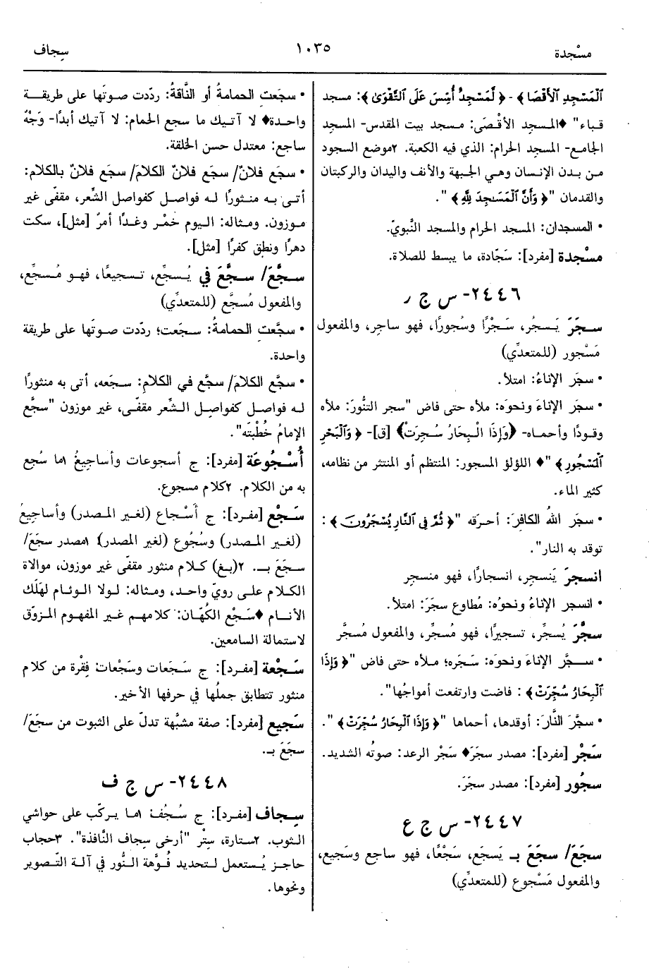 • سجَّر الإناءَ ونحوَه: سَجَره؛ ملأه حتى فاض " {وَإِذَا الْبِحَارُ سُجِّرَتْ}: فاضت وارتفعت أمواجُها".