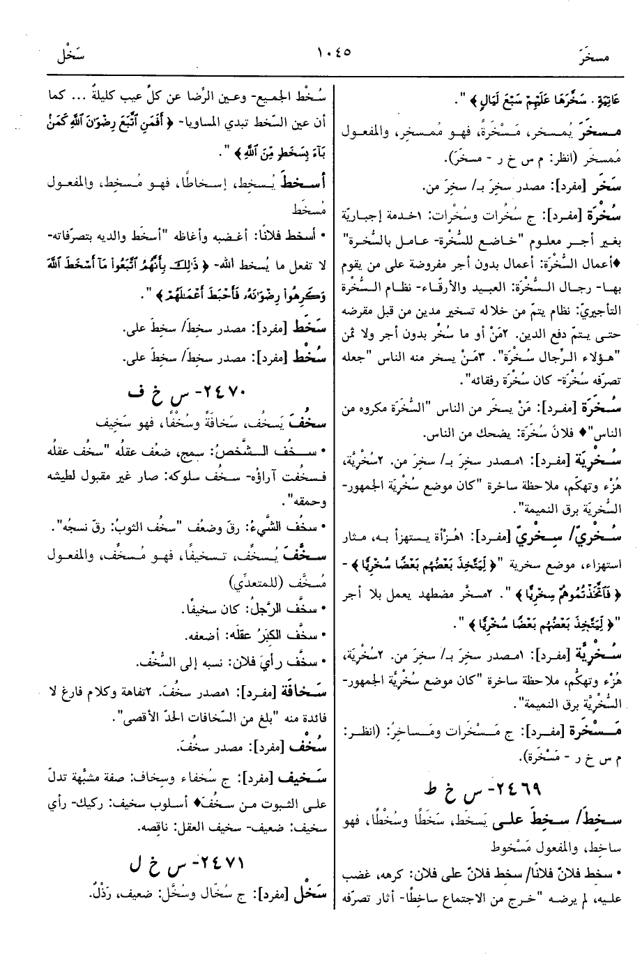 1 - خدمة إجباريّة بغير أجر معلوم "خاضع للسُّخْرة- عامل بالسُّخرة" ° أعمال السُّخْرَة: أعمال بدون أجر مفروضة على من يقوم بها- رجال السُّخْرَة: العبيد والأرقّاء- نظام السُّخْرة التأجيريّ: نظام يتمّ من خلاله تسخير مدين من قبل مقرضه حتى يتمّ دفع الدين.