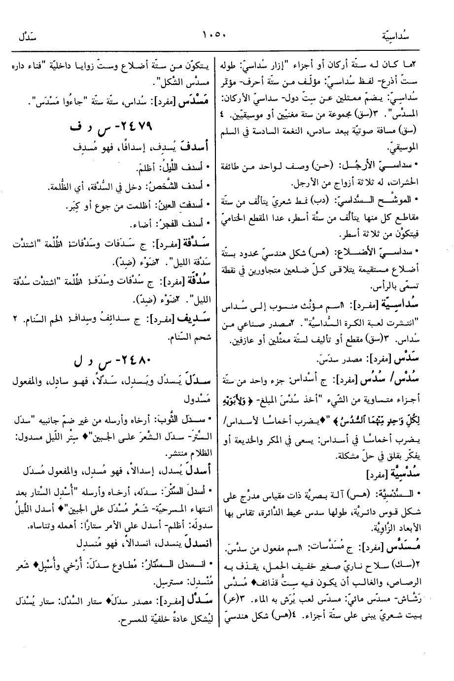 4 - (هس) شكل هندسيّ يتكوّن من ستّة أضلاع وستّ زوايا داخليّة "فناء داره مسدَّس الشَّكل".