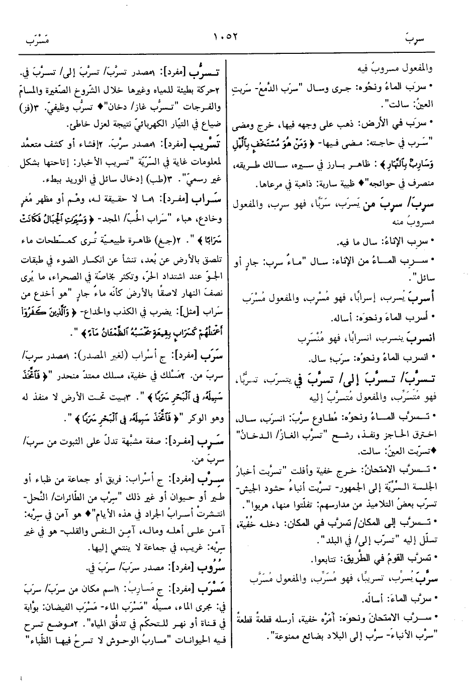 • تسرَّب الماءُ ونحوُه: مُطاوع سرَّبَ: انسرَب، سال، اخترق الحاجز ونفذ، رشح "تسرَّب الغازُ/ الدخانُ" ° تسرّبت العينُ: سالت.