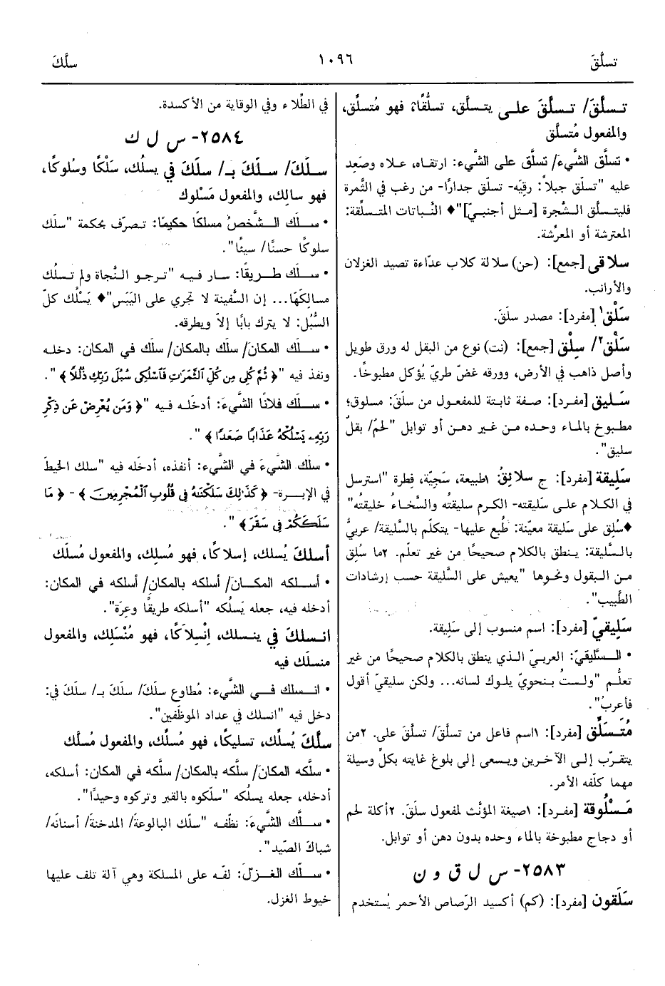 • سلَك فلانًا الشَّيءَ: أدخَله فيه " {وَمَنْ يُعْرِضْ عَنْ ذِكْرِ رَبِّهِ يَسْلُكْهُ عَذَابًا صَعَدًا} ".