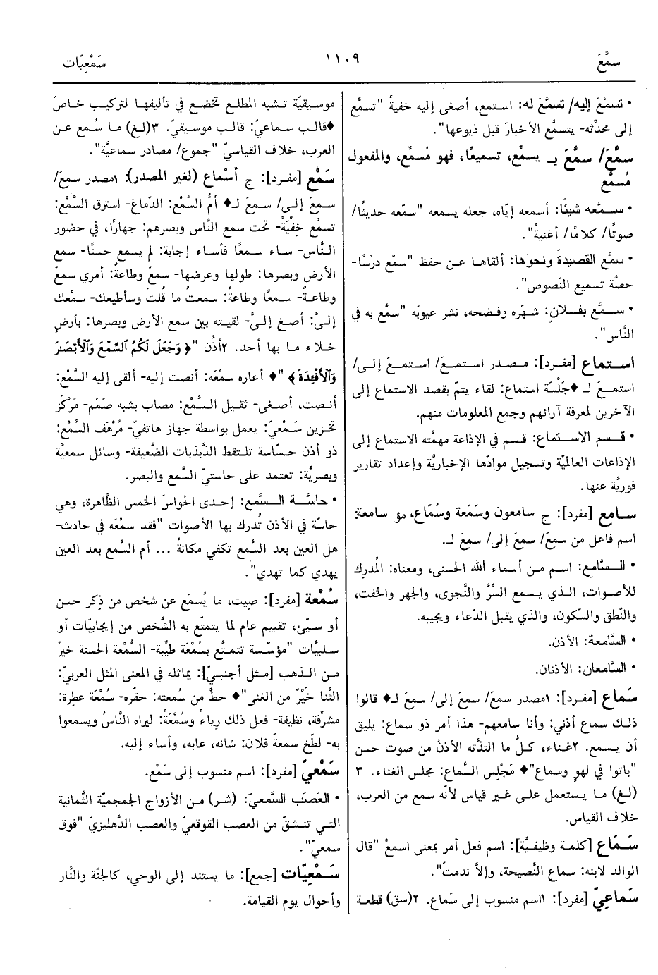 2 - أذُن " {وَجَعَلَ لَكُمُ السَّمْعَ وَالأَبْصَارَ وَالأَفْئِدَةَ} " ° أعاره سمْعَه: أنصت إليه- ألقى إليه السَّمْع: أنصت، أصغى- ثقيل السَّمْع: مصاب بشبه صَمَم- مَرْكَز تخزين سَمْعيّ: يعمل بواسطة جهاز هاتفيّ- مُرْهَف السَّمْع: ذو أذن حسّاسة تلتقط الذَّبذبات الضَّعيفة- وسائل سمعيَّة وبصريَّة: تعتمد على حاستيّ السَّمع والبصر.