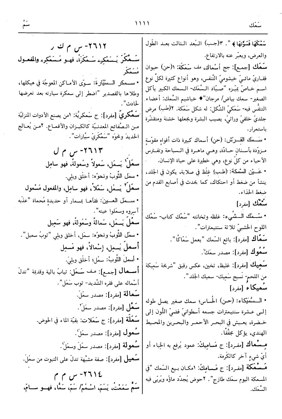 1 - (حن) حيوان فقاريّ مائيّ خيشوميّ التَّنفس، وهو أنواع كثيرة لكلِّ نوع اسم خاصّ يميّزه "صيّاد السَّمَك- السمك الكبير يأكل الصغير- سمك بياض/ مرجان" ° خياشيم السَّمك: أعضاء التنفُّس فيه- سَمَكيّ الشَّكل: له شكل سَمَكة.