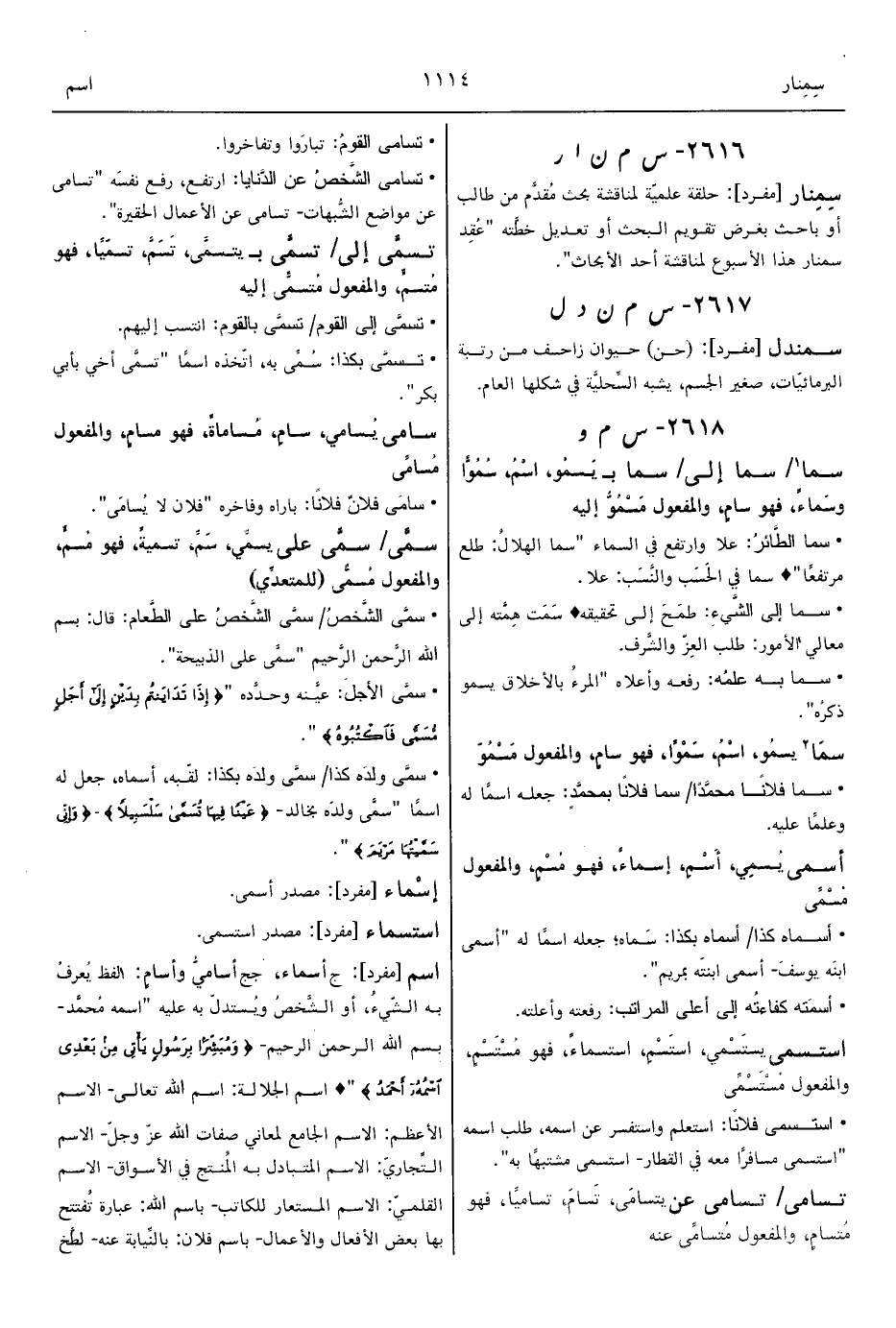 1 - لفظ يُعرفُ به الشّيءُ، أو الشَّخصُ ويُستدلّ به عليه "اسمه مُحمَّد- بسم الله الرحمن الرحيم- {وَمُبَشِّرًا بِرَسُولٍ يَأْتِي مِنْ بَعْدِي اسْمُهُ أَحْمَدُ} " ° اسم الجلالة: اسم الله تعالى- الاسم الأعظم: الاسم الجامع لمعاني صفات الله عزّ وجلّ- الاسم التِّجاريّ: الاسم المتبادل به المُنتج في الأسواق- الاسم القلميّ: الاسم المستعار للكاتب- باسم الله: عبارة تُفتتح بها بعض الأفعال والأعمال- باسم فلان: بالنِّيابة عنه- لطَّخ