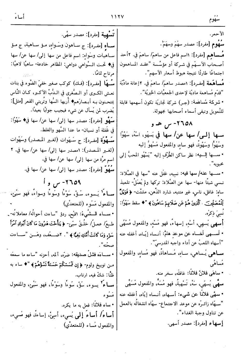• سها عنه/ سها فيه: نسِيه، غفَل عنه "سها في الصَّلاة: نسي شيئًا منها- سها عن الصَّلاة: تركها ولم يُصَلِّ- تلميذ ساهٍ: غافل، ناسٍ، غير منتبه، شارد الذِّهن، مشتَّت- {فَوَيْلٌ لِلْمُصَلِّينَ. الَّذِينَ هُمْ عَنْ صَلاَتِهِمْ سَاهُونَ} " ° سقط سَهْوًا: نُسِيَ ذِكرُه.