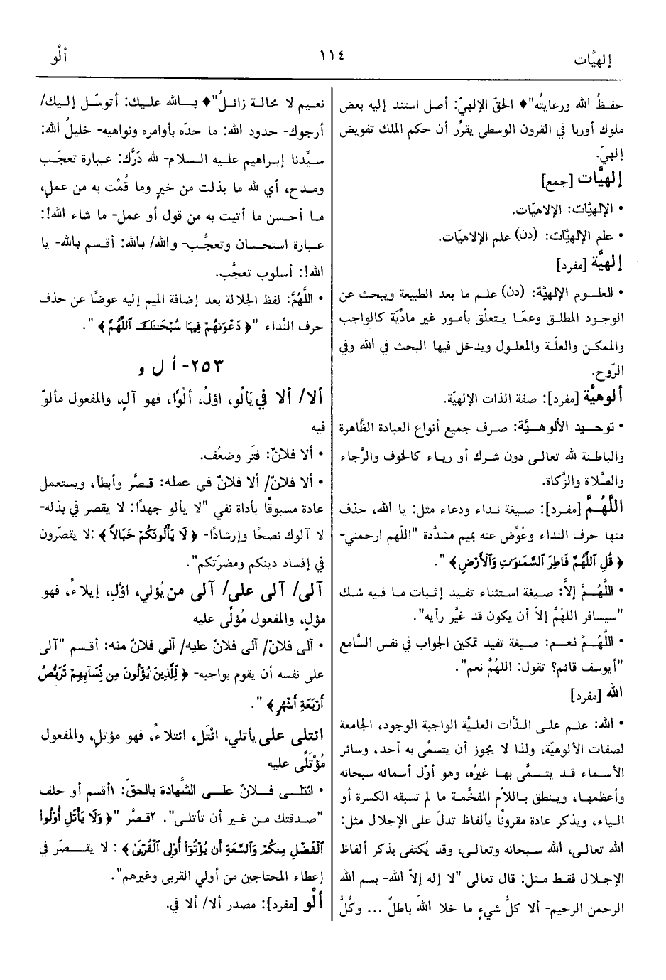 • الله: علم على الذَّات العليَّة الواجبة الوجود، الجامعة لصفات الألوهيّة، ولذا لا يجوز أن يتسمَّى به أحد، وسائر الأسماء قد يتسمَّى بها غيرُه، وهو أوّل أسمائه سبحانه وأعظمها، وينطق باللاّم المفخَّمة ما لم تسبقه الكسرة أو الياء، ويذكر عادة مقرونًا بألفاظ تدلّ على الإجلال مثل: الله تعالى، الله سبحانه وتعالى، وقد يُكتفى بذكر ألفاظ الإجلال فقط مثل: قال تعالى "لا إله إلاّ الله- بسم الله الرحمن الرحيم- ألا كلُّ شيءٍ ما خلا اللهَ باطلٌ ... وكُلُّ نعيم لا محالة زائلُ" ° بالله عليك: أتوسّل إليك/ أرجوك- حدود الله: ما حدّه بأوامره ونواهيه- خليلُ الله: سيِّدنا إبراهيم عليه السلام- لله دَرُّك: عبارة تعجّب ومدح، أي لله ما بذلت من خيرٍ وما قُمْت به من عملٍ، ما أحسن ما أتيت به من قول أو عمل- ما شاء الله!: عبارة استحسان وتعجُّب- والله/ بالله: أقسم بالله- يا الله!: أسلوب تعجُّب.