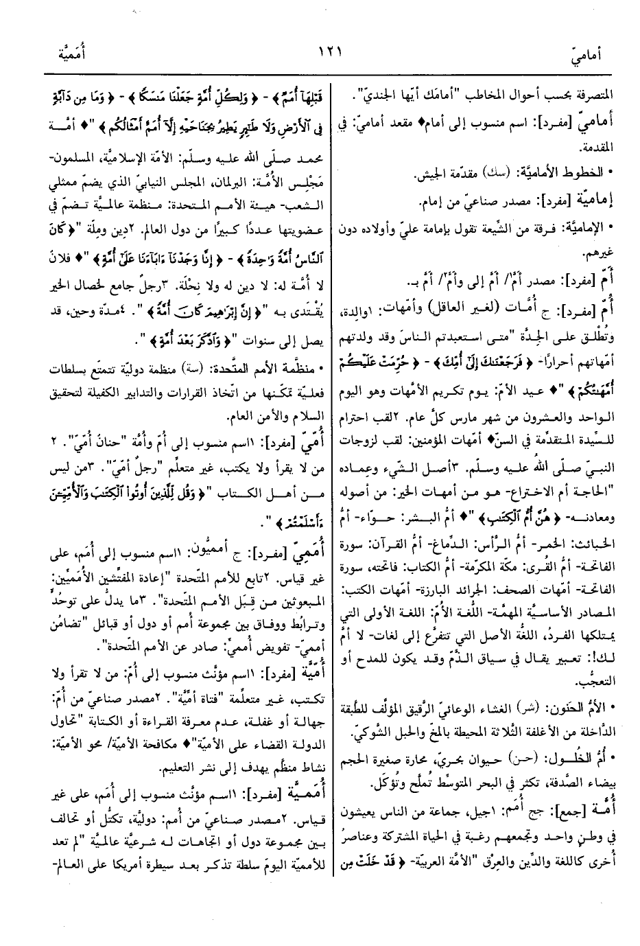 2 - دِين ومِلّة " {كَانَ النَّاسُ أُمَّةً وَاحِدَةً} - {إِنَّا وَجَدْنَا ءَابَاءَنَا عَلَى أُمَّةٍ} " ° فلانٌ لا أُمَّة له: لا دين له ولا نِحْلَة.