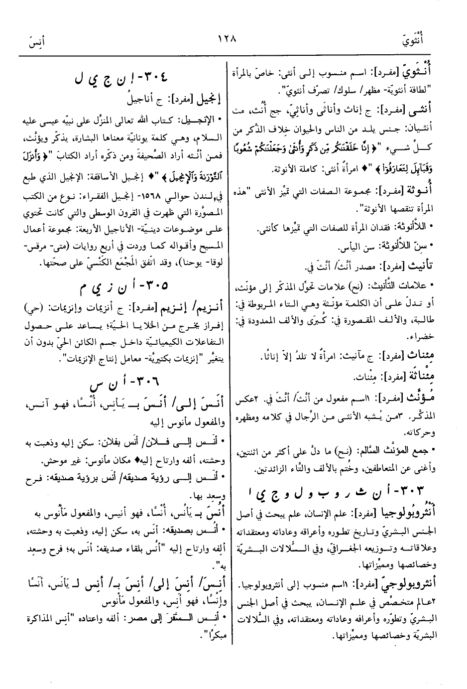 • الإنجيل: كتاب الله تعالى المنزَّل على نبيّه عيسى عليه السلام، وهي كلمة يونانيّة معناها البشارة، يذكّر ويؤنَّث، فمن أنَّثه أراد الصَّحيفةَ ومن ذكّره أراد الكتابَ " {وَأَنْزَلَ التَّوْرَاةَ وَالإِنْجِيلَ} " ° إنجيل الأساقفة: الإنجيل الذي طبع في لندن حوالي 1568 - إنجيل الفقراء: نوع من الكتب المصوَّرة التي ظهرت في القرون الوسطى والتي كانت تحتوي على موضوعات دينيّة- الأناجيل الأربعة: مجموعة أعمال المسيح وأقواله كما وردت في أربع روايات (متى- مرقس- لوقا- يوحنا)، وقد اتّفق المَجْمَع الكَنْسيّ على صحّتها.