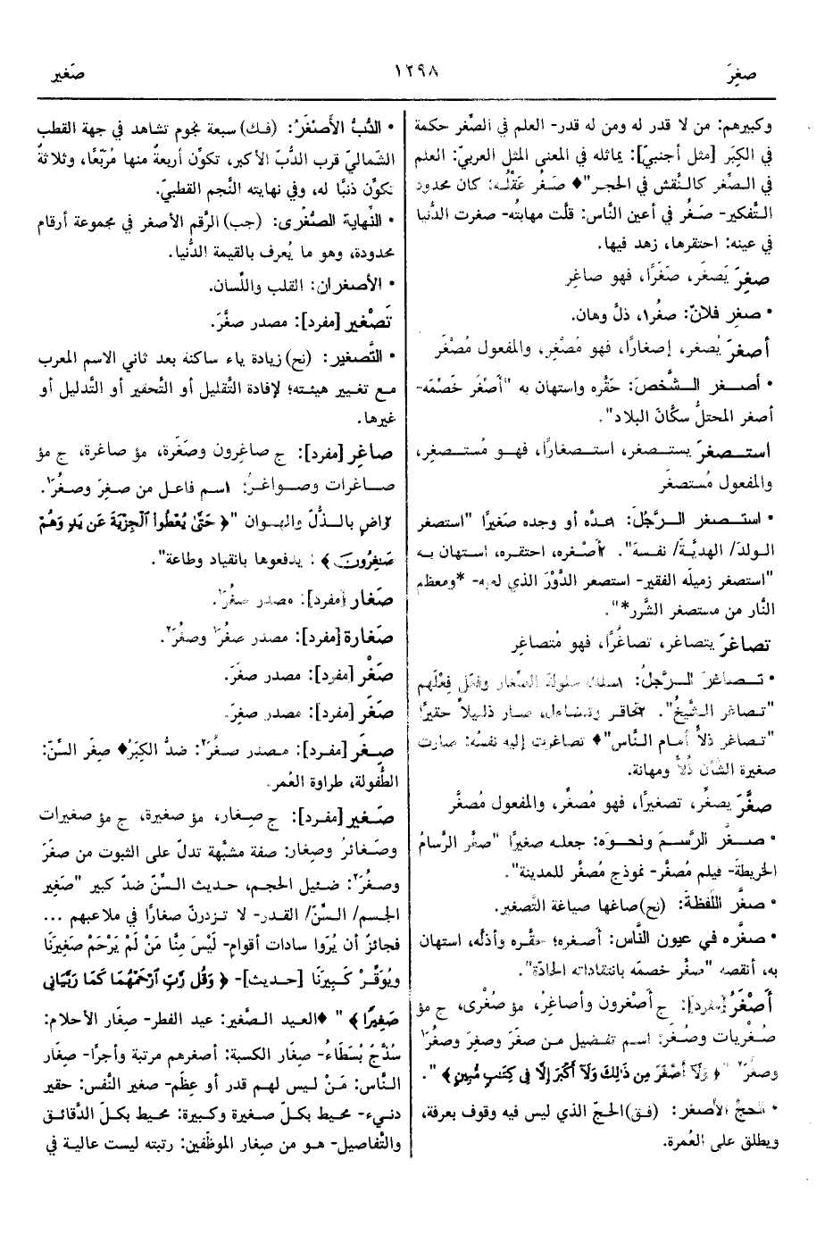 صَغير [مفرد]: ج صِغار، مؤ صغيرة، ج مؤ صغيرات وصَغائرُ وصِغار: صفة مشبَّهة تدلّ على الثبوت من صغَرَ وصغُرَ2: ضئيل الحجم، حديث السِّنّ ضدّ كبير "صَغِير الجسم/ السِّنّ/ القدر- لا تزدرنّ صغارًا في ملاعبهم ... فجائزٌ أن يُرَوا سادات أقوامِ- لَيْسَ مِنَّا مَنْ لَمْ يَرْحَمْ صَغِيرَنَا ويُوَقِّرْ كَبِيرَنَا [حديث]- {وَقُلْ رَبِّ ارْحَمْهُمَا كَمَا رَبَّيَانِي صَغِيرًا} " ° العيد الصَّغير: عيد الفطر- صِغَار الأحلام: سُذَّجٌ بُسَطَاءُ- صِغَار الكسبة: أصغرهم مرتبة وأجرًا- صِغَار النَّاس: مَنْ ليس لهم قدر أو عِظَم- صغير النَّفس: حقير دنيء- محيط بكلّ صغيرة وكبيرة: محيط بكلّ الدَّقائق والتَّفاصيل- هو من صِغار الموظّفين: رتبته ليست عالية في