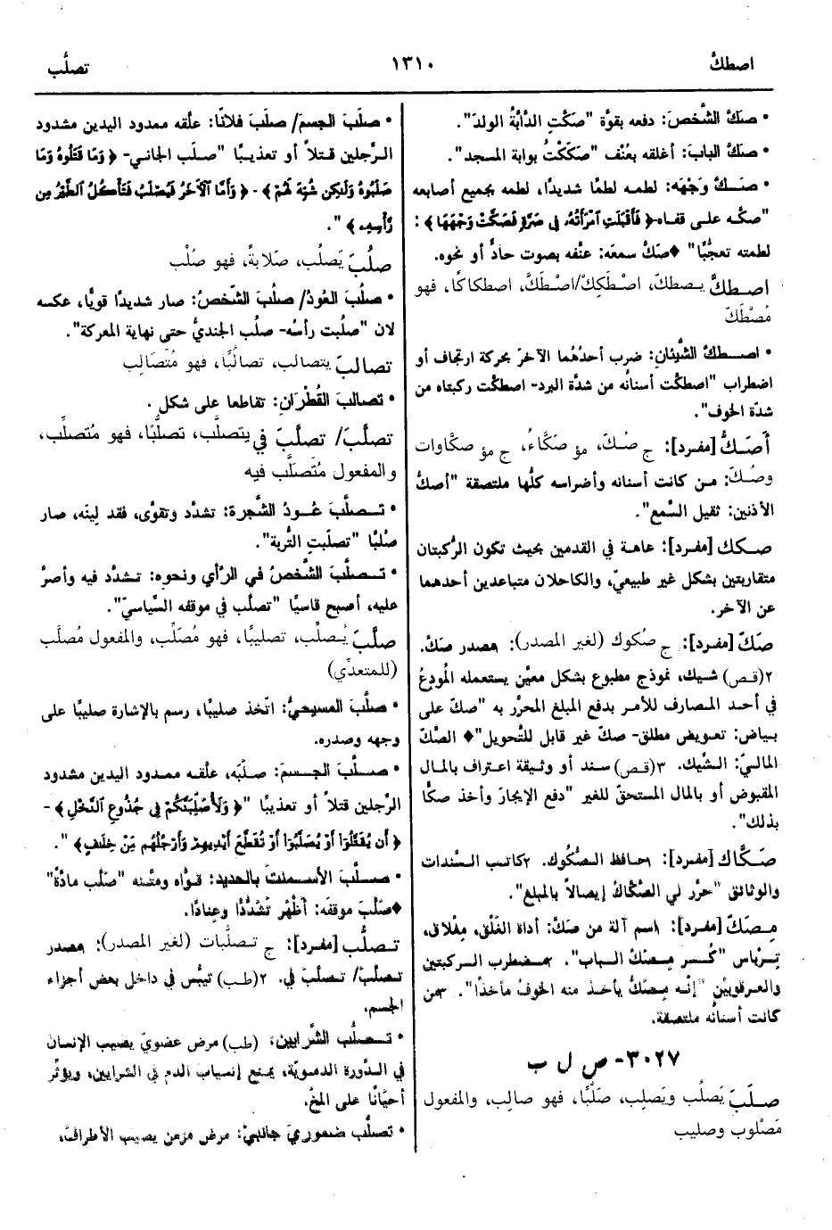 • صلَّبَ الجسمَ: صلَبَه، علَّقه ممدود اليدين مشدود الرِّجلين قتلاً أو تعذيبًا " {وَلأُصَلِّبَنَّكُمْ فِي جُذُوعِ النَّخْلِ} - {أَنْ يُقَتَّلُوا أَوْ يُصَلَّبُوا أَوْ تُقَطَّعَ أَيْدِيهِمْ وَأَرْجُلُهُمْ مِنْ خِلاَفٍ} ".