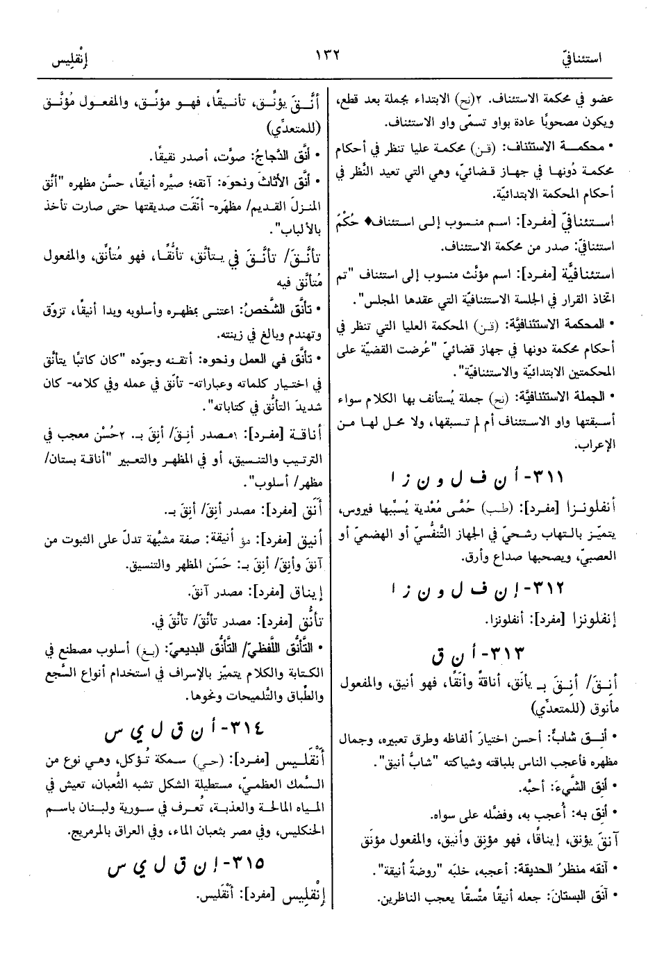 • تأنَّق في العمل ونحوه: أتقنه وجوّده "كان كاتبًا يتأنَّق في اختيار كلماته وعباراته- تأنّق في عمله وفي كلامه- كان شديدَ التأنُّق في كتاباته".
