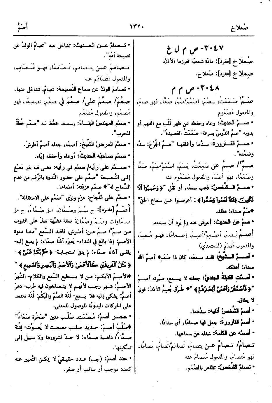 • صمَّ الشَّخصُ: ذهب سمعُه، أو ثقُل " {وَحَسِبُوا أَلاَّ تَكُونَ فِتْنَةٌ فَعَمُوا وَصَمُّوا}: أعرضوا عن سماع الحقّ" ° صُمَّ صداه: هلك.