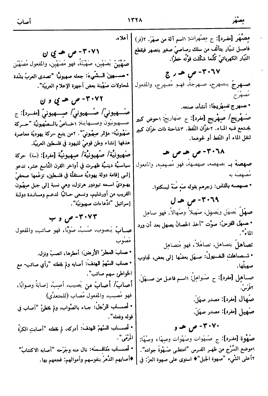 • صهينَ الشّيءَ: جعله صهيونيًّا "تصدى العربُ بشّدة لمحاولات صَهْينة بعض أجهزة الإعلام العربيّة".