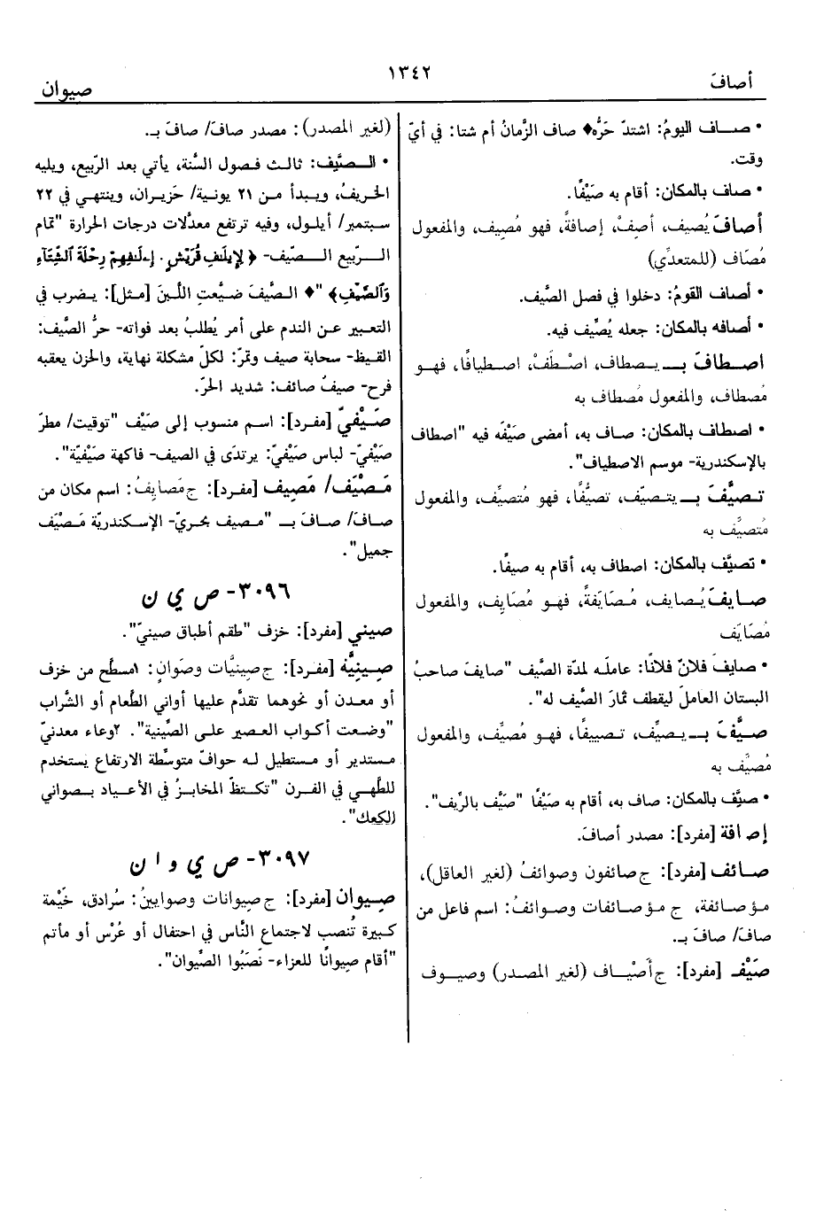 • الصَّيف: ثالث فصول السَّنة، يأتي بعد الرّبيع، ويليه الخريفُ، ويبدأ من 21 يونية/ حَزيران، وينتهي في 22 سبتمبر/ أيلول، وفيه ترتفع معدَّلات درجات الحرارة "تمام الرّبيع الصّيف- {لإِيلاَفِ قُرَيْش. إِيلاَفِهِمْ رِحْلَةَ الشِّتَاءِ وَالصَّيْفِ} " ° الصَّيفَ ضيَّعتِ اللَّبنَ [مثل]: يضرب في التعبير عن الندم على أمر يُطلبُ بعد فواته- حرُّ الصَّيف: القيظ- سحابة صيف وتمرّ: لكلّ مشكلة نهاية، والحزن يعقبه فرح- صيفٌ صائف: شديد الحرّ.