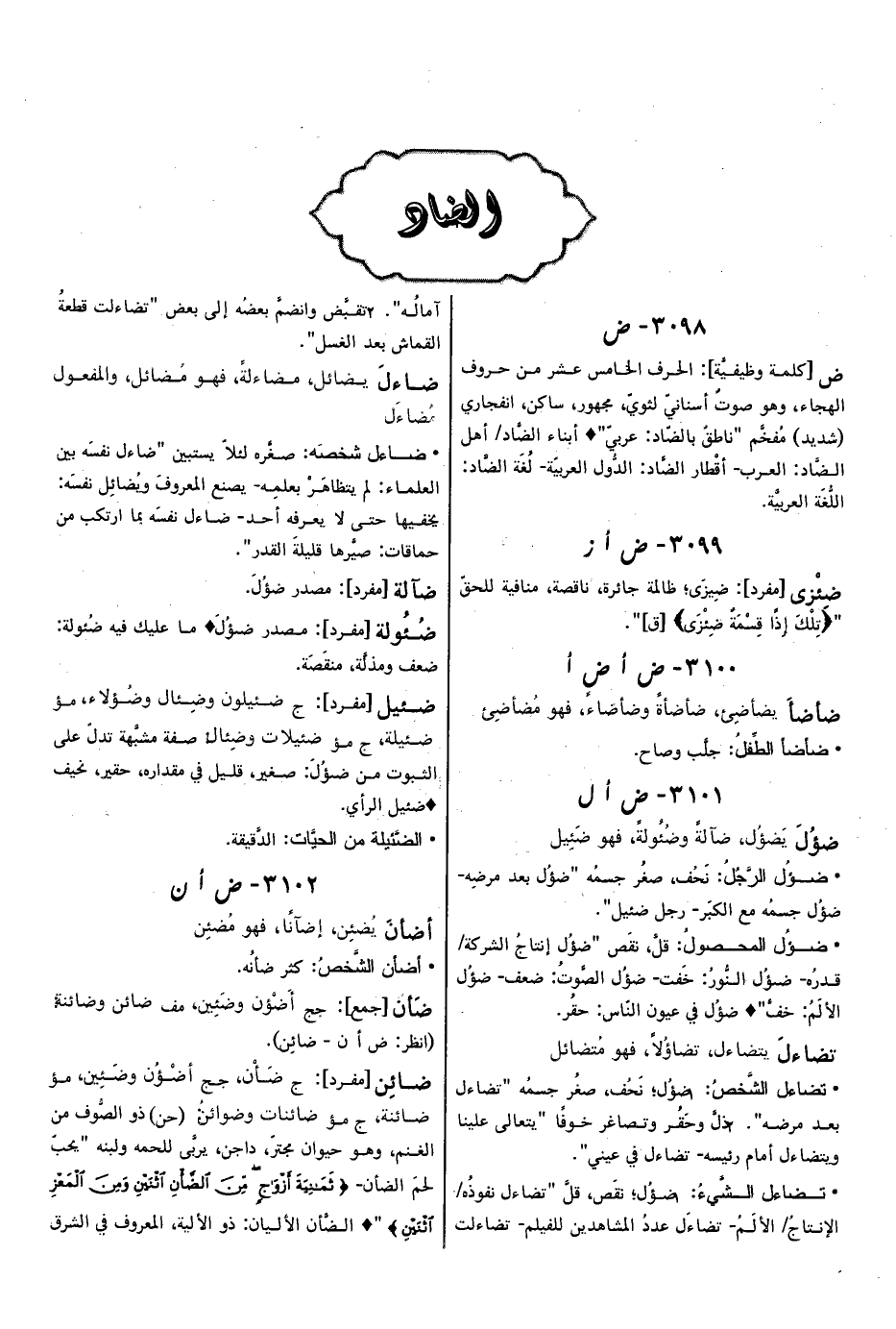 ض [كلمة وظيفيَّة]: الحرف الخامس عشر من حروف الهجاء، وهو صوتٌ أسنانيّ لثويّ، مجهور، ساكن انفجاريّ (شديد)، مُفخَّم "ناطقٌ بالضّاد: عربيّ" ° أبناء الضَّاد/ أهل الضَّاد: العرب- أقْطار الضَّاد: الدُّول العربيّة- لُغَة الضَّاد: اللُّغَة العربيَّة.