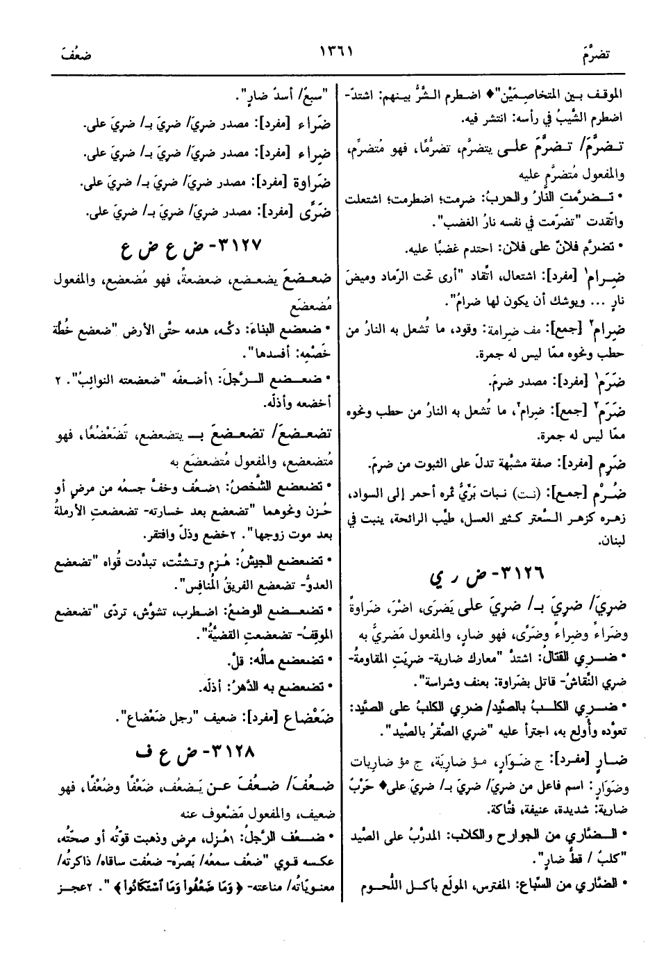 • ضرِي القتالُ: اشتدَّ "معارك ضارية- ضرِيَتِ المقاومةُ- ضرِي النِّقاشُ- قاتل بضَراوة: بعنف وشراسة".