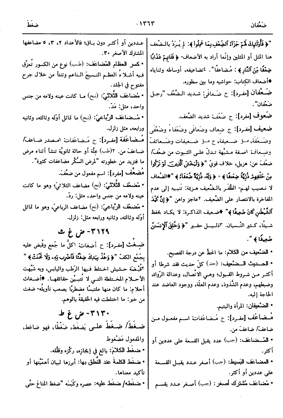 1 - صفة مشبَّهة تدلّ على الثبوت من ضعُفَ/ ضعُفَ عن: هزيل، خلاف قويّ " {وَلْيَخْشَ الَّذِينَ لَوْ تَرَكُوا مِنْ خَلْفِهِمْ ذُرِّيَّةً ضِعَافًا} - {وَلَهُ ذُرِّيَّةٌ ضُعَفَاءُ} " ° الضِّعاف لا نصيب لهم- الظَّفَر بالضَّعيف هزيمة: تَنبيه إلى عدم المفاخرة بالانتصار على الضَّعيف.