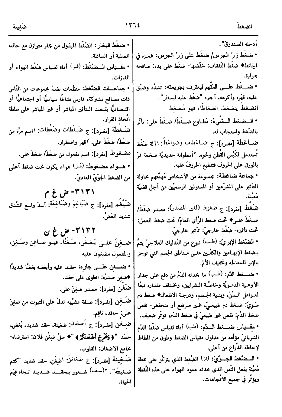 • ضغط الدَّم: (طب) ما يحدثه الدّمُ من دفع على جدار الأوعية الدمويَّة وخاصَّة الشرايين، ويختلف مقداره تبعًا لعوامل السِّنّ، وبنية الجسم، ودرجة الانفعال? ضغط دم سَوِيّ: ضغط دم طبيعيّ، غير مرتفع أو منخفض- نقص ضغط الدَّم: نقص غير طبيعيّ في ضغط الدّم، توتّر ضعيف.