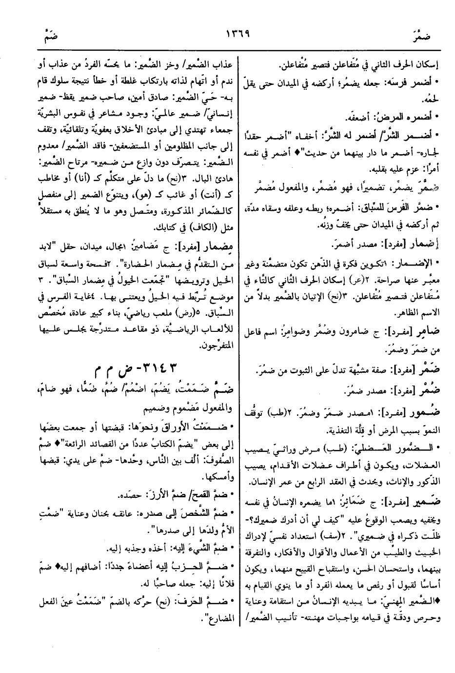 2 - (سف) استعداد نفسيّ لإدراك الخبيث والطيِّب من الأعمال والأقوال والأفكار، والتفرقة بينهما، واستحسان الحسن، واستقباح القبيح منهما، ويكون أساسًا لقبول أو رفض ما يعمله الفرد أو ما ينوي القيام به ° الضَّمير المِهنيّ: ما يبديه الإنسانُ من استقامة وعناية وحرص ودقّة في قيامه بواجبات مهنته- تأنيب الضَّمير/ عذاب الضَّمير/ وخز الضَّمير: ما يحسّه الفردُ من عذاب أو ندم أو اتّهام لذاته بارتكاب غلطة أو خطأ نتيجة سلوك قام به- حَيّ الضَّمير: صادق أمين، صاحب ضمير يقظ- ضمير إنسانيّ/ ضمير عالميّ: وجود مشاعر في نفوس البشريّة جمعاء تهتدي إلى مبادئ الأخلاق بعفويّة وتلقائيّة، وتقف إلى جانب المظلومين أو المستضعفين- فاقد الضَّمير/ معدوم الضَّمير: يتصرّف دون وازع من ضميره- مرتاح الضَّمير: هادئ البال.