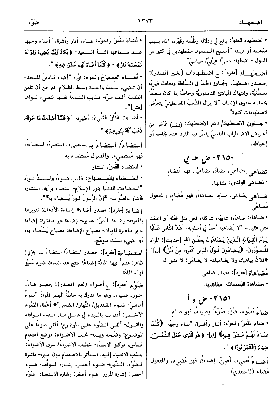 • أضاءَ القَمرُ ونحوُه: ضاء؛ أنار وأشرق "أضاء وجهها عند سماعها النبأ السعيد- {يَكَادُ زَيْتُهَا يُضِيءُ وَلَوْ لَمْ تَمْسَسْهُ نَارٌ} - {كُلَّمَا أَضَاءَ لَهُمْ مَشَوْا فِيهِ} ".