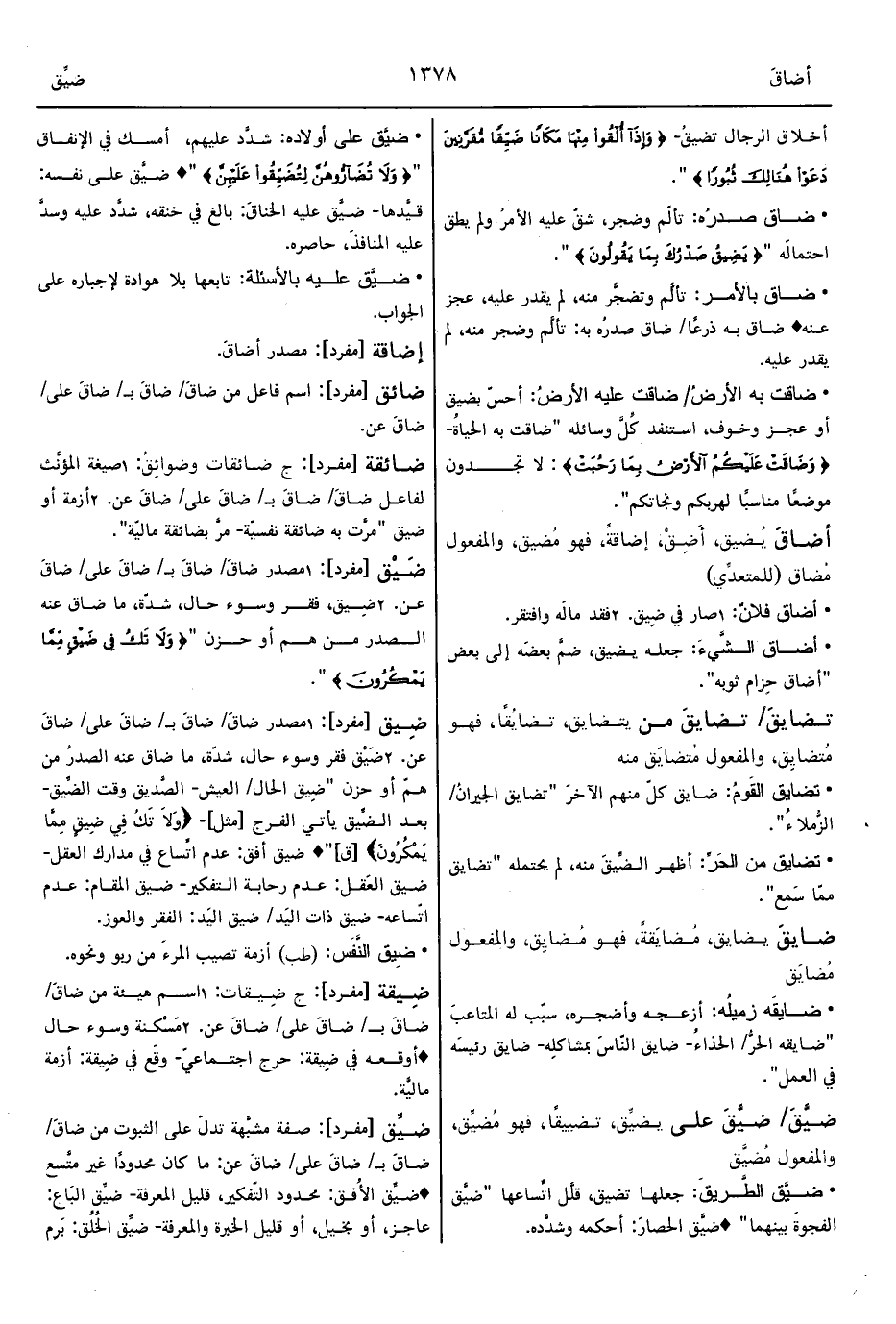 2 - ضِيق؛ فقر وسوء حال، شدّة، ما ضاق عنه الصدرُ من همّ أو حزن " {وَلاَ تَكُ فِي ضَيْقٍ مِمَّا يَمْكُرُونَ} ".