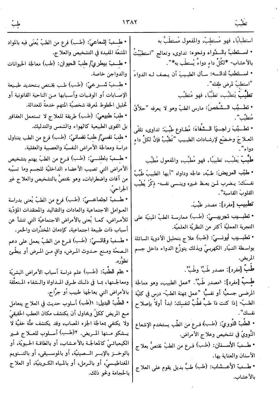 2 - عمل الطبيب، وهو معالجة المرضى جسميًّا أو نفسيًّا "عمل بمهنة الطبّ- درس في كليّة الطبّ- إذا كنت ذا طبٍّ فطُبَّ لنفسِك: ابدأ أولاً بإصلاح نفسك".