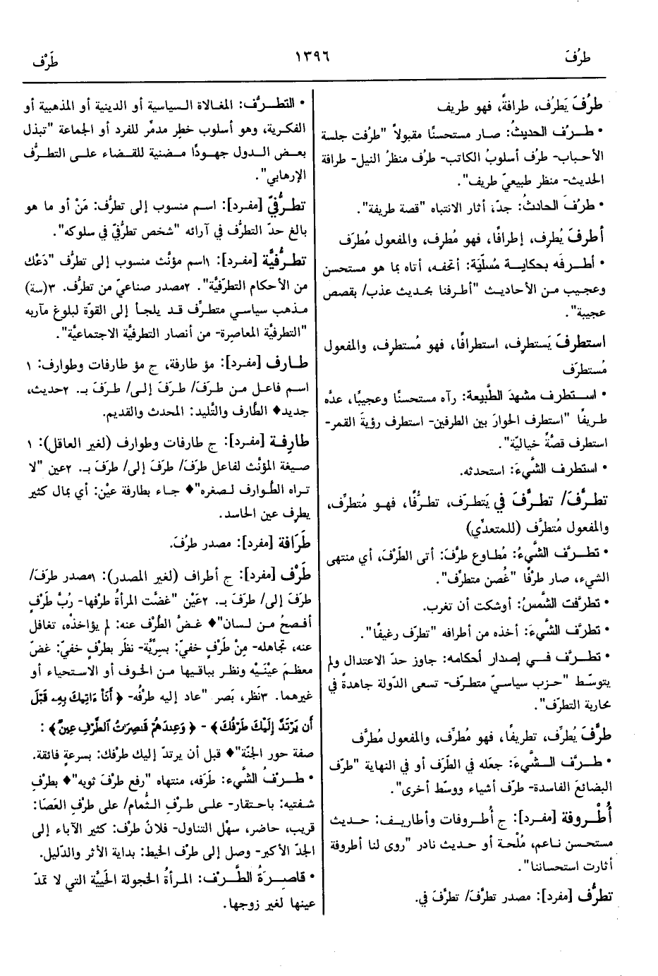 • تطرَّف الشَّيءُ: مُطاوع طرَّفَ: أتى الطّرْفَ، أي منتهى الشيء، صار طرْفًا "غُصن متطرِّف".