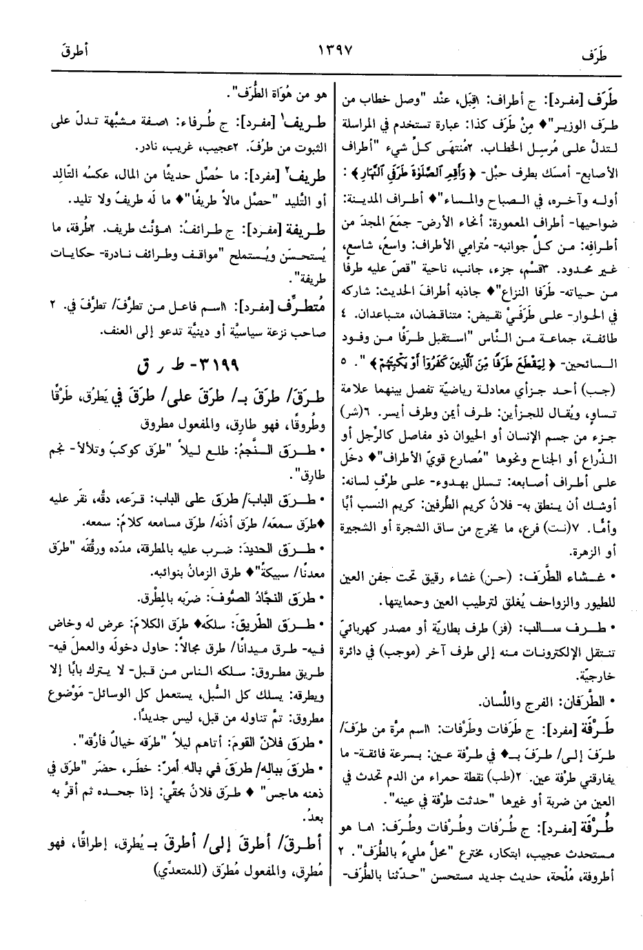 2 - مُنتهَى كلِّ شيء "أطراف الأصابع- أمسَك بطرف حبْل- {وَأَقِمِ الصَّلاَةَ طَرَفَيِ النَّهَارِ}: أوله وآخره، في الصباح والمساء" ° أطراف المدينة: ضواحيها- أطراف المعمورة: أنحاء الأرض- جمَعَ المجدَ من أطرافِه: من كلِّ جوانبه- مُترامِي الأطراف: واسعٌ، شاسع، غير محدود.