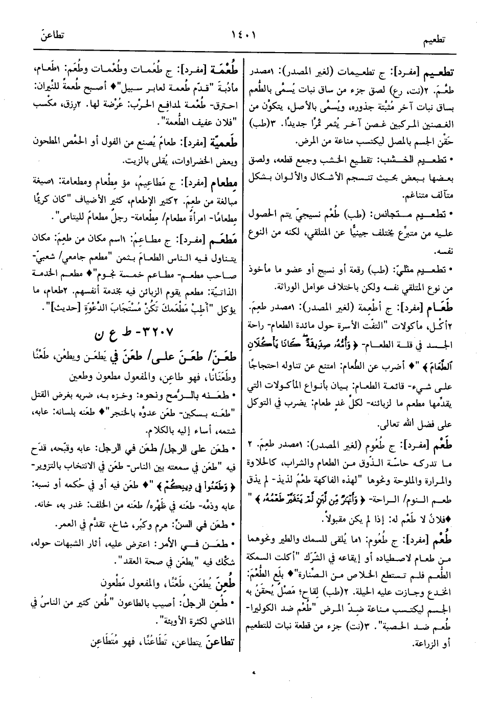 2 - أكْل، مأكولات "التفّت الأسرة حول مائدة الطعام- راحة الجسد في قلة الطعام- {وَأُمُّهُ صِدِّيقَةٌ كَانَا يَأْكُلاَنِ الطَّعَامَ} " ° أضرب عن الطَّعام: امتنع عن تناوله احتجاجًا على شيء- قائمة الطعام: بيان بأنواع المأكولات التي يقدِّمها مطعم ما لزبائنه- لكلِّ غدٍ طعام: يضرب في التوكل على فضل الله تعالى.