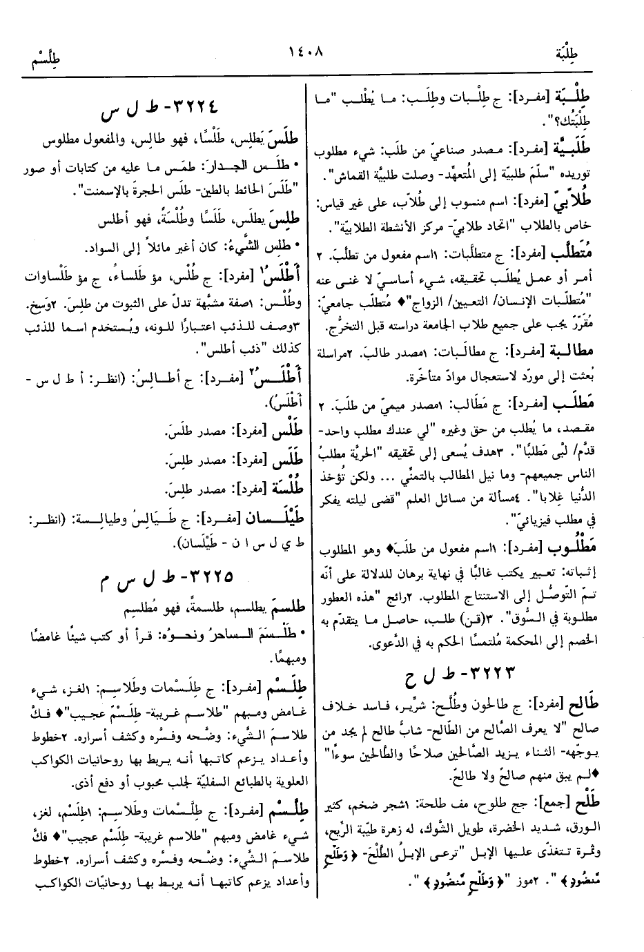 1 - شجر ضخم، كثير الورق، شديد الخضرة، طويل الشَّوك، له زهرة طيّبة الرِّيح، وثمرة تتغذّى عليها الإبل "ترعى الإبلُ الطَّلْحَ- {وَطَلْحٍ مَنْضُودٍ} ".