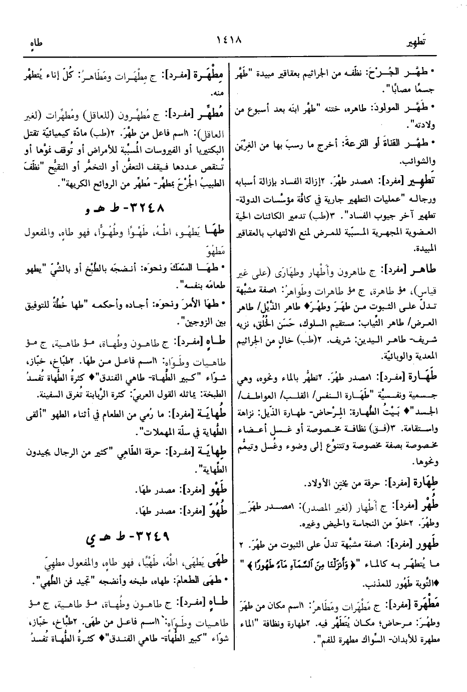 2 - تطهُّر بالماء ونحوه، وهي جسمية ونفسيَّة "طَهَارة النفس/ القلب/ العواطف/ الجسد" ° بَيْتُ الطَّهارة: المِرْحاض- طهارة الذّيل: نزاهة واستقامة.