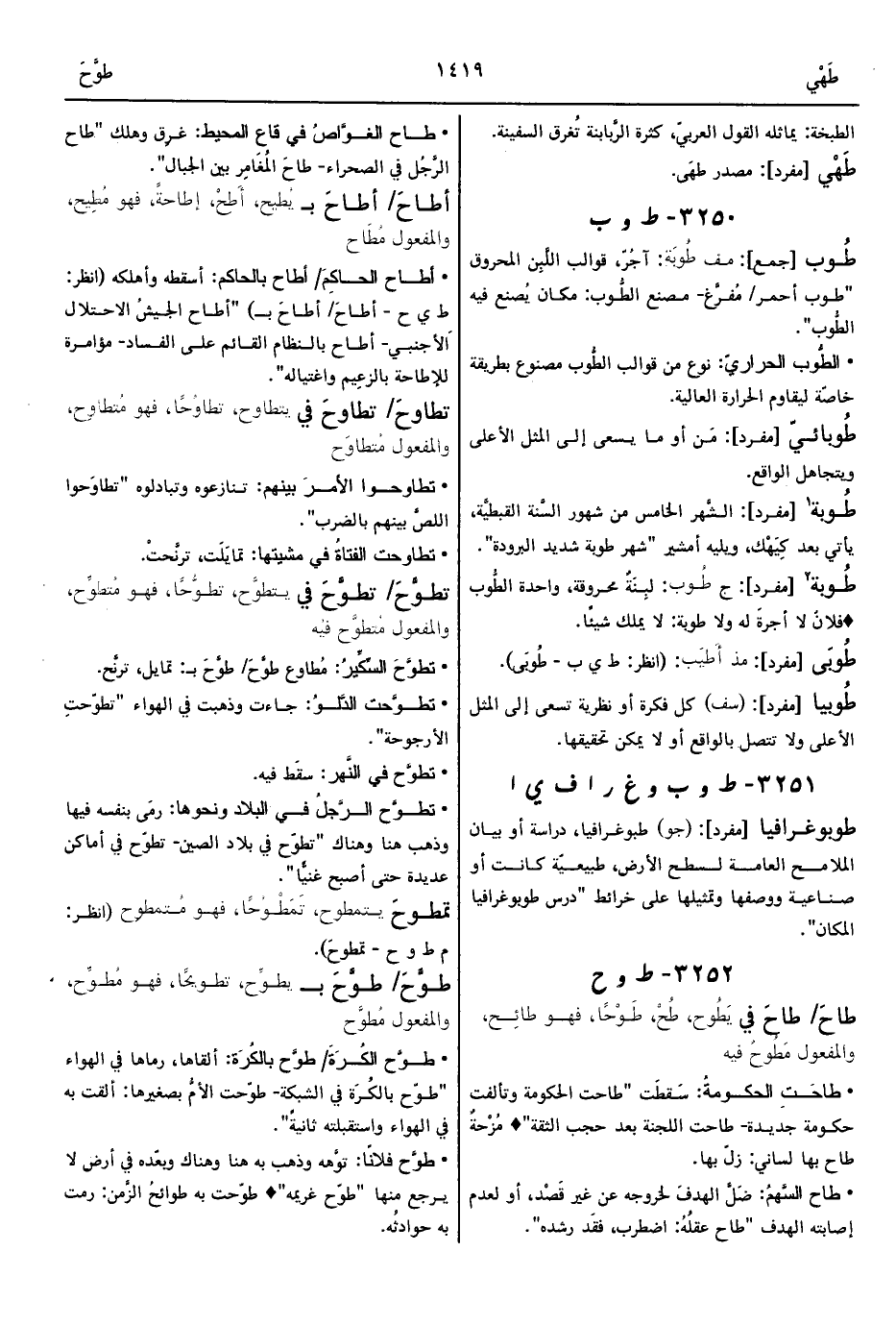 • طاح السَّهمُ: ضَلَّ الهدفَ لخروجه عن غير قَصْد، أو لعدم إصابته الهدف "طاح عقلُهُ: اضطرب، فقَد رشده".