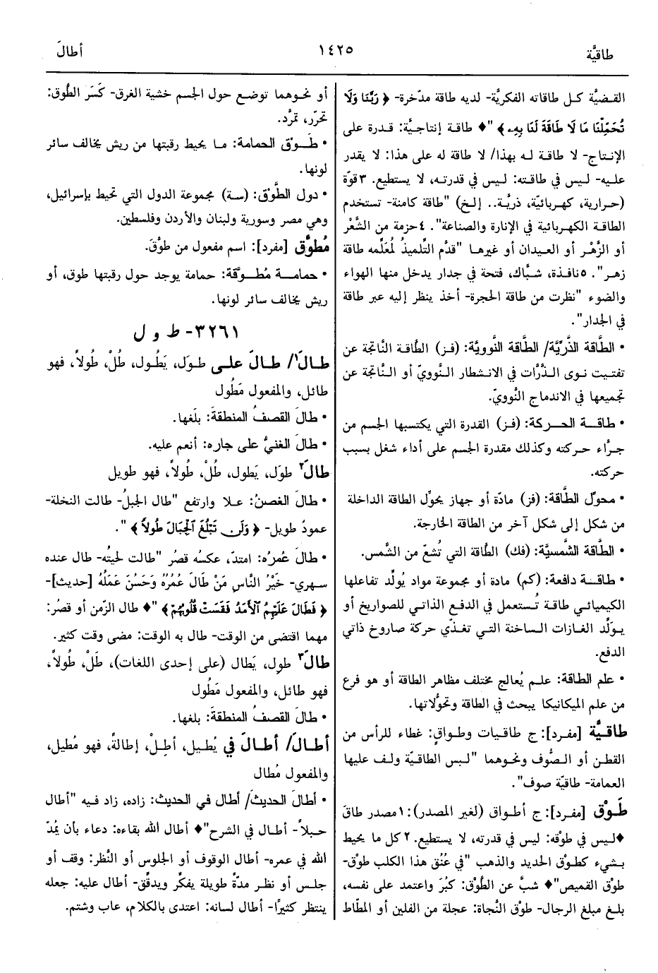 • طالَ الغصنُ: علا وارتفع "طال الجبلُ- طالت النخلة- عمودٌ طويل- {وَلَنْ تَبْلُغَ الْجِبَالَ طُولاً} ".