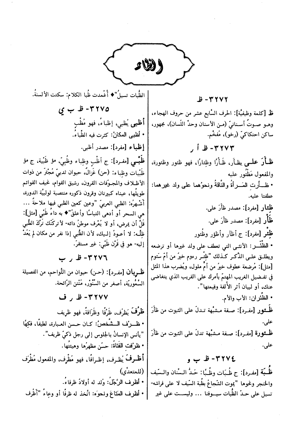 ظ [كلمة وظيفيَّة]: الحرف السَّابع عشر من حروف الهجاء، وهو صوتٌ أسنانيّ (من الأسنان وحدِّ اللّسان)، مجهور، ساكن احتكاكيّ (رخو)، مُفخَّم.