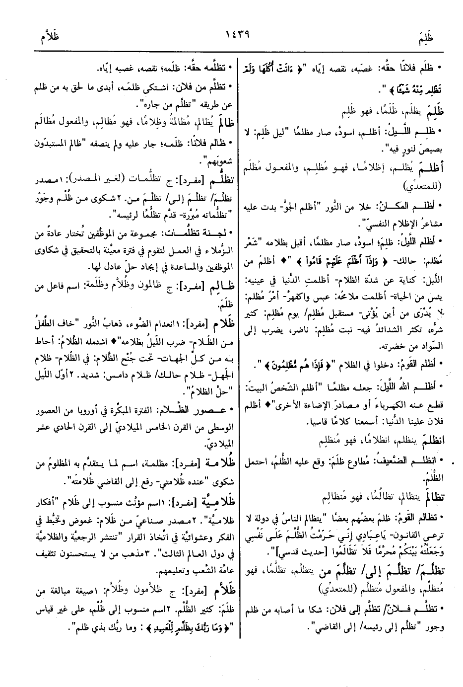 • أظلم اللَّيلُ: ظلِمَ؛ اسودَّ، صار مظلمًا، أقبل بظلامه "شَعْر مُظلم: حالك- {وَإِذَا أَظْلَمَ عَلَيْهِمْ قَامُوا} " ° أظلمتِ الدُّنيا في عينيه: يئس من الحياة- أظلمت ملامحُه: عبس واكفهرَّ- أظلمُ من اللَّيل: كناية عن شدّة الظلام- أمْرٌ مُظلم: لا يُدْرَى من أين يُؤْتى- مستقبل مُظلِم/ يوم مُظلِم: كثير شرُّه، تكثر الشدائدُ فيه- نبت مُظلِم: ناضر، يضرب إلى السّواد من خضرته.
